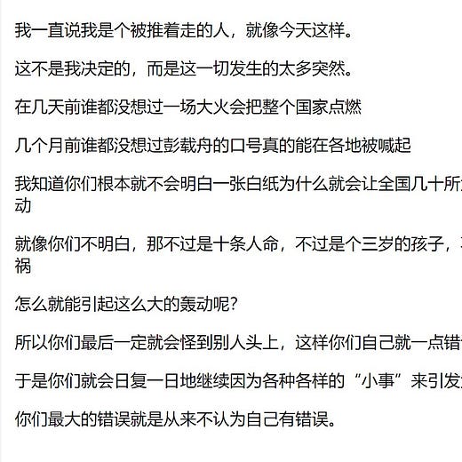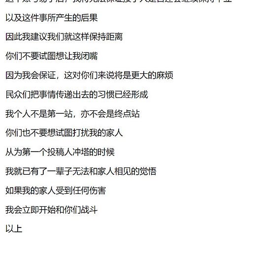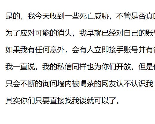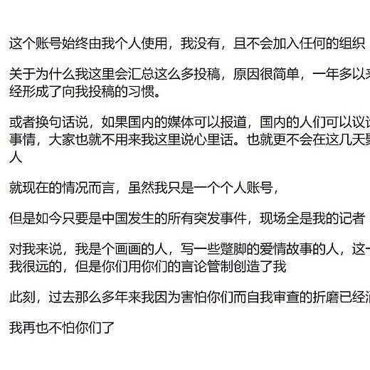 但另一方面,我也知道这是一条没有回头路的选择。从小被共产党所渲染的恐怖所规训,我当时甚至担心发着发着就会有人破门而入把我抓走。