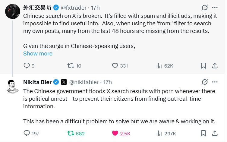何: 你刚才提到了一个很关键的问题,即党国在海外社交媒体平台上的势力和策略。前段时间 Twitter (X) 的产品经理 Nikita 曾提到,一旦发生关于中国的政治讨论,就会有大量中文色情账号涌现来扰乱舆论。这显然是国家能力在干扰海外舆情,通过色情信息等方式来对冲和缓解压力。从你的角度观察,党国在 Twitter、YouTube 等平台上具体的镇压和干扰策略还有哪些?